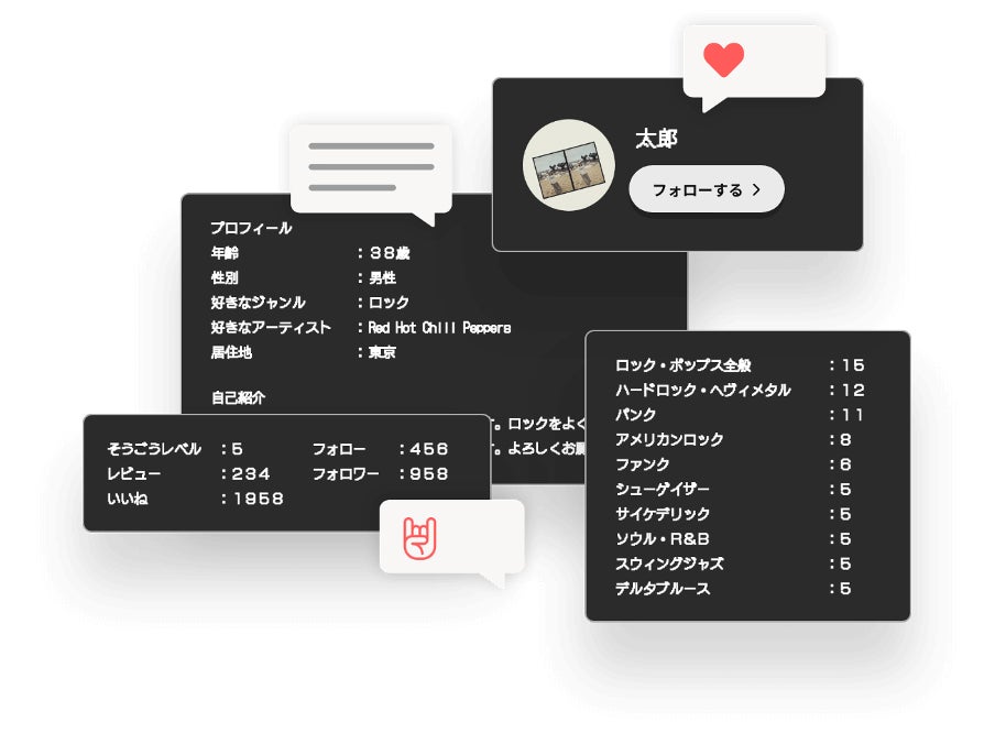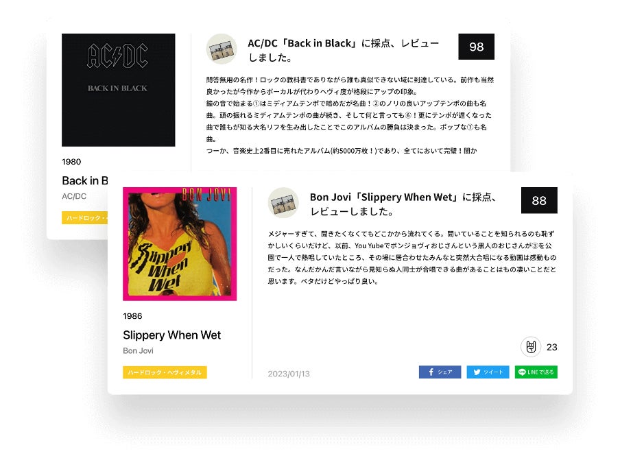 レビュー機能:体験した音楽を採点、レビューしたり、他のユーザーの音楽体験をチェックすることで、他のユーザーとつながったり、感動をシェアすることができます。