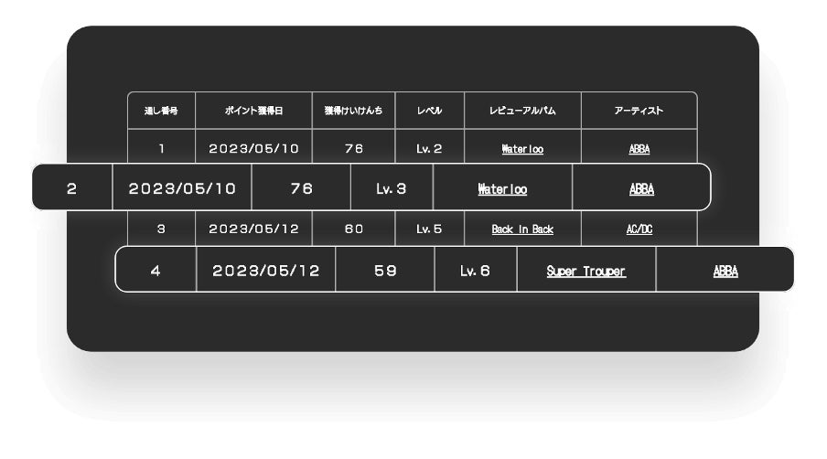 レベルアップ機能:音楽に採点、レビューすることでレベルアップし、冒険するように音楽を楽しむことができます。