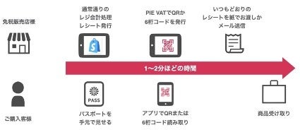 アプリ「PIE VAT」でスピーディーに免税還付手続きが完了するため、TMT店舗の業務負荷軽減・効率化が期待できます。また、お客様はお手持ちのスマホ(アプリ)で簡単に免税還付手続が完了するため、免税ショッピングにおける顧客体験向上を実現します。
