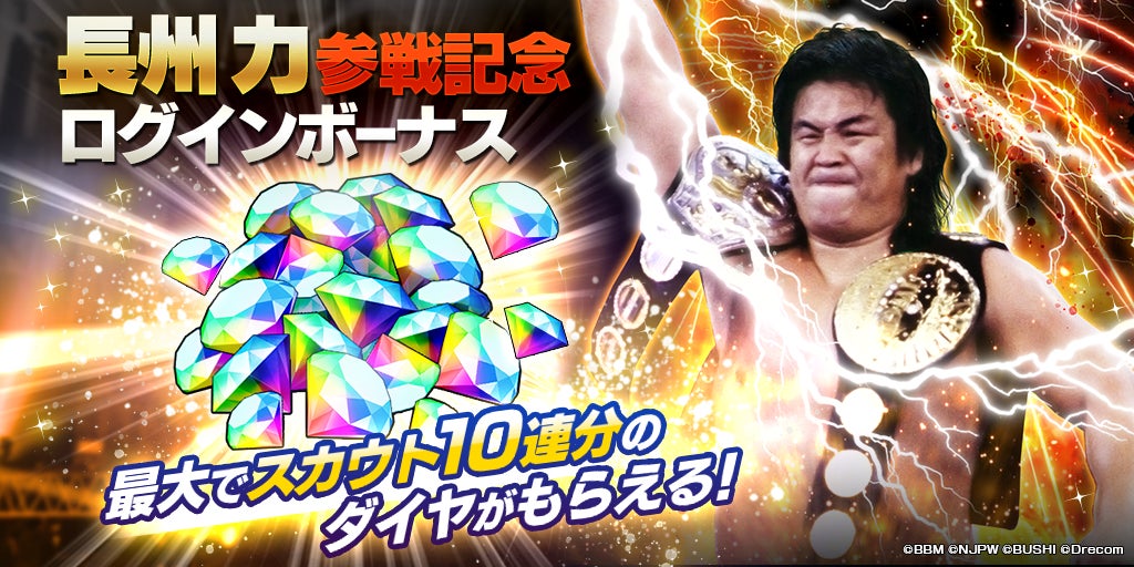- 長州力参戦記念として、最大で1,500ダイヤ(10連スカウト1回分)が獲得できるログインボーナスを開催中!