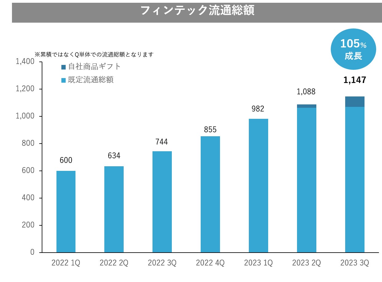 当社は、2027年9月期流通総額1,000億円の目標に向けて、資金移動業の取得、デザインテンプレート追加などの機能拡充をはじめとしたサービスの品質向上、また、カスタマーサクセスによるクライアント満足度向上及び営業活動の強化を推進しております。今回、日々の業務推進が実を結び、多くの企業様にご利用いただけた結果、2023年第3四半期において流通総額が11億円を突破、13四半期連続成長を実現いたしました。