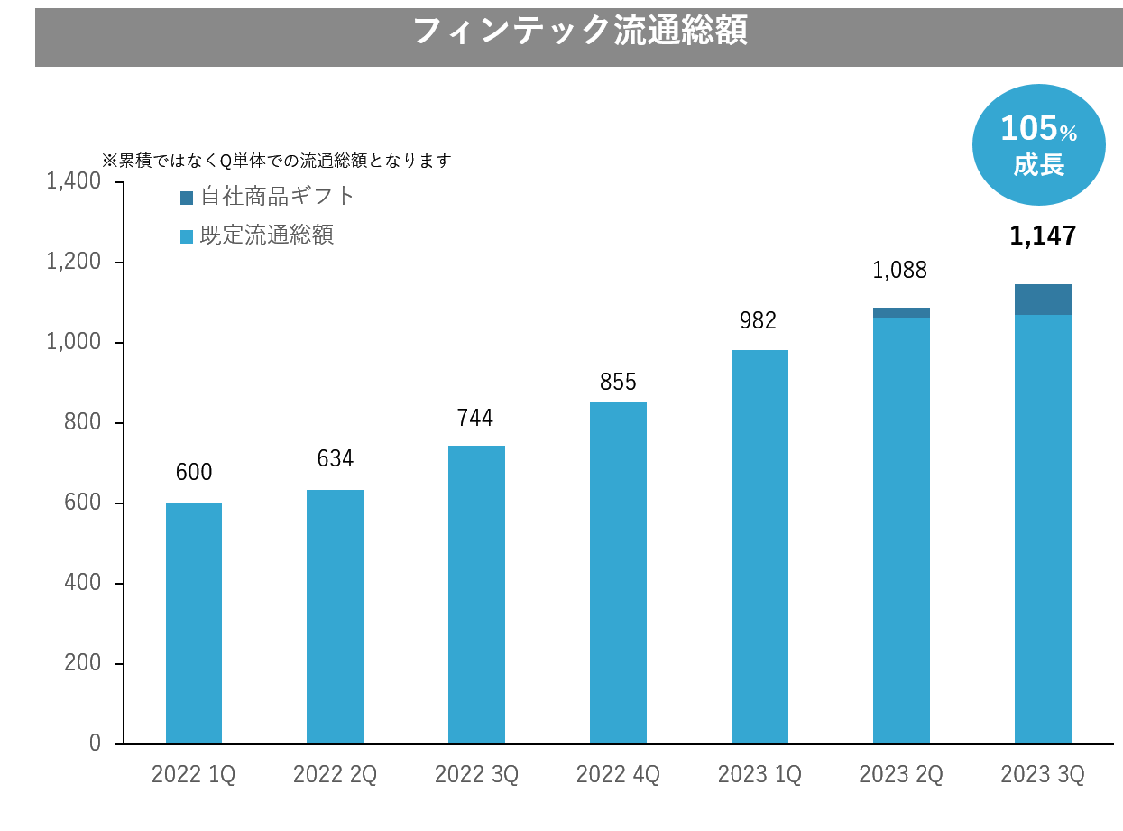 当社は、2027年9月期流通総額1,000億円の目標に向けて、資金移動業の取得、デザインテンプレート追加などの機能拡充をはじめとしたサービスの品質向上、また、カスタマーサクセスによるクライアント満足度向上及び営業活動の強化を推進しております。今回、日々の業務推進が実を結び、多くの企業様にご利用いただけた結果、2023年第3四半期において流通総額が11億円を突破、13四半期連続成長を実現いたしました。