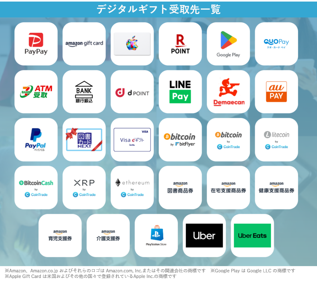 アンケート回答、資料請求、お見積もりの謝礼、社内イベントのインセンティブ、etc.