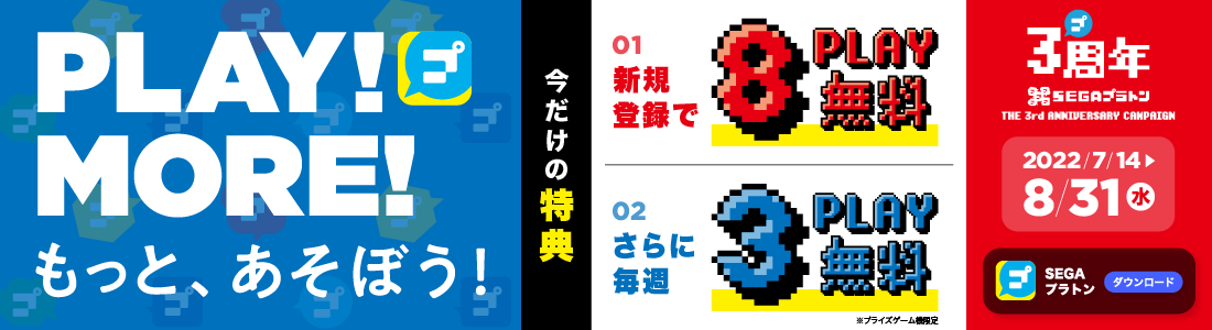 株式会社GENDA GiGO Entertainment(本社:東京都大田区 代表取締役社長:上野 聖)は、当社※が運営する店舗公式アプリ『SEGAプラトン』のサービス開始3周年を記念したおトクなキャンペーンを開催いたします。