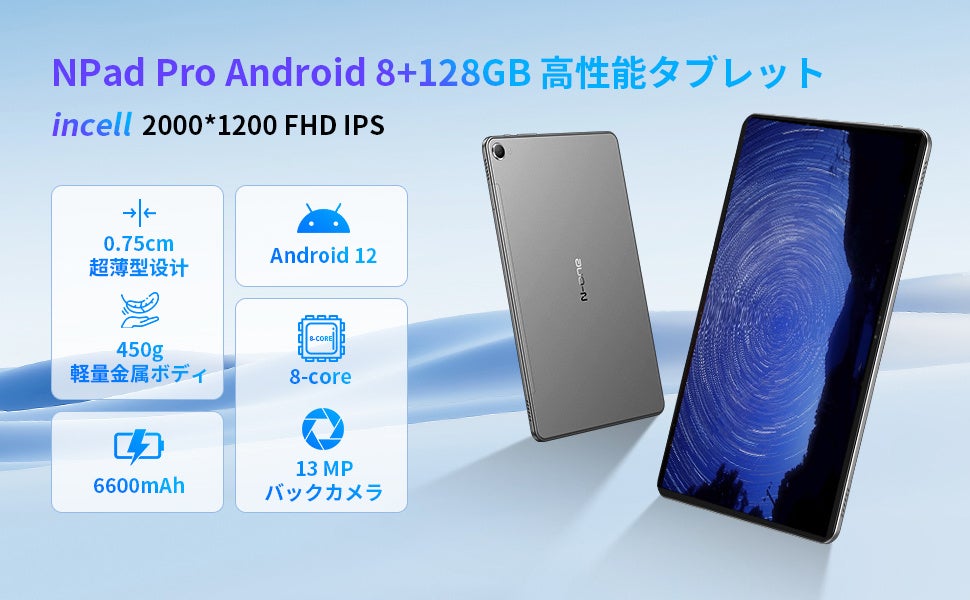 最新のAndroid 12を搭載した10.4インチフラットパネルWi-Fiタブレットは、ホールセンサーにも対応しています(注:対応する指定のレザーケースと一致する必要があります)。画面オフと画面オンを自動で切り替える機能もあります。また、タブレットNPad Proは18W USB-PD急速充電に対応しており、充電時間を短縮できます(注:18Wアダプターは別売りですが、タブレットには充電器とType-C充電ケーブルが付属しています)。さらに、安心の12ヶ月メンテナンス保証も提供しています。