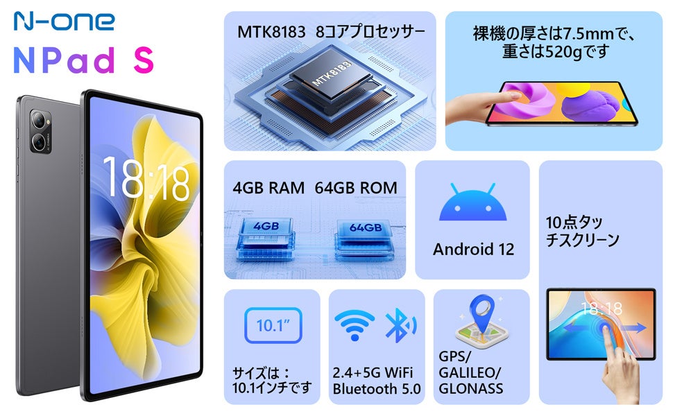 N-one Npad S Android 12 タブレット 10.1インチ wi-fiモデル、 タブレット 8コア CPU 2.0Ghz、4GB+64GB+1TB TF拡張可能、1280*800解像度HD IPSディスプレイ、 GMS認証+2.4G/5G WiFi+6600mAh、Bluetooth 5.0+GPS+2MP/5MPカメラ 子供にも適当贈り物/子供用タブレットPC、オンライン授業 [SIM対応しない]日本語取扱説明書付き
