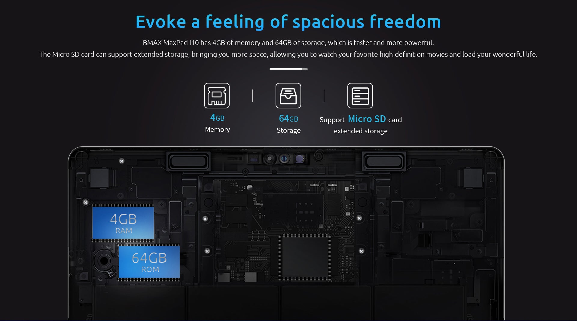 Bmax maxpad i10には4GBのメモリと64GBのストレージがあり、より高速で強力です。 マイクロSDカードは拡張ストレージをサポートし、より広いスペースを提供し、お気に入りの高解像度映画を視聴して素晴らしい生活を送ることができます。