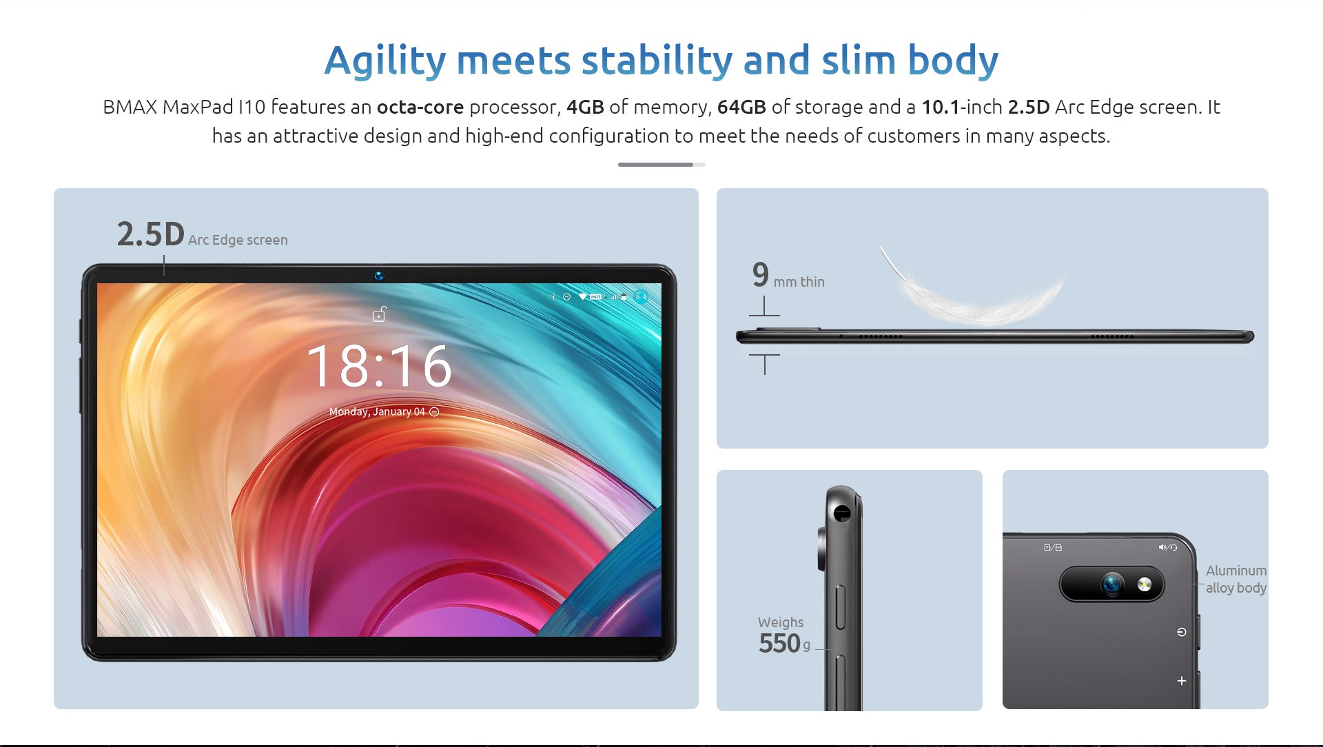 Bmax maxpad i10は、オクタコアプロセッサ、4GBメモリ、64GBストレージ、および10.1インチ2.5dアークエッジスクリーンを備えています。 さまざまな面でお客様のニーズを満たすために、魅力的なデザインとハイエンドの構成を採用しています。