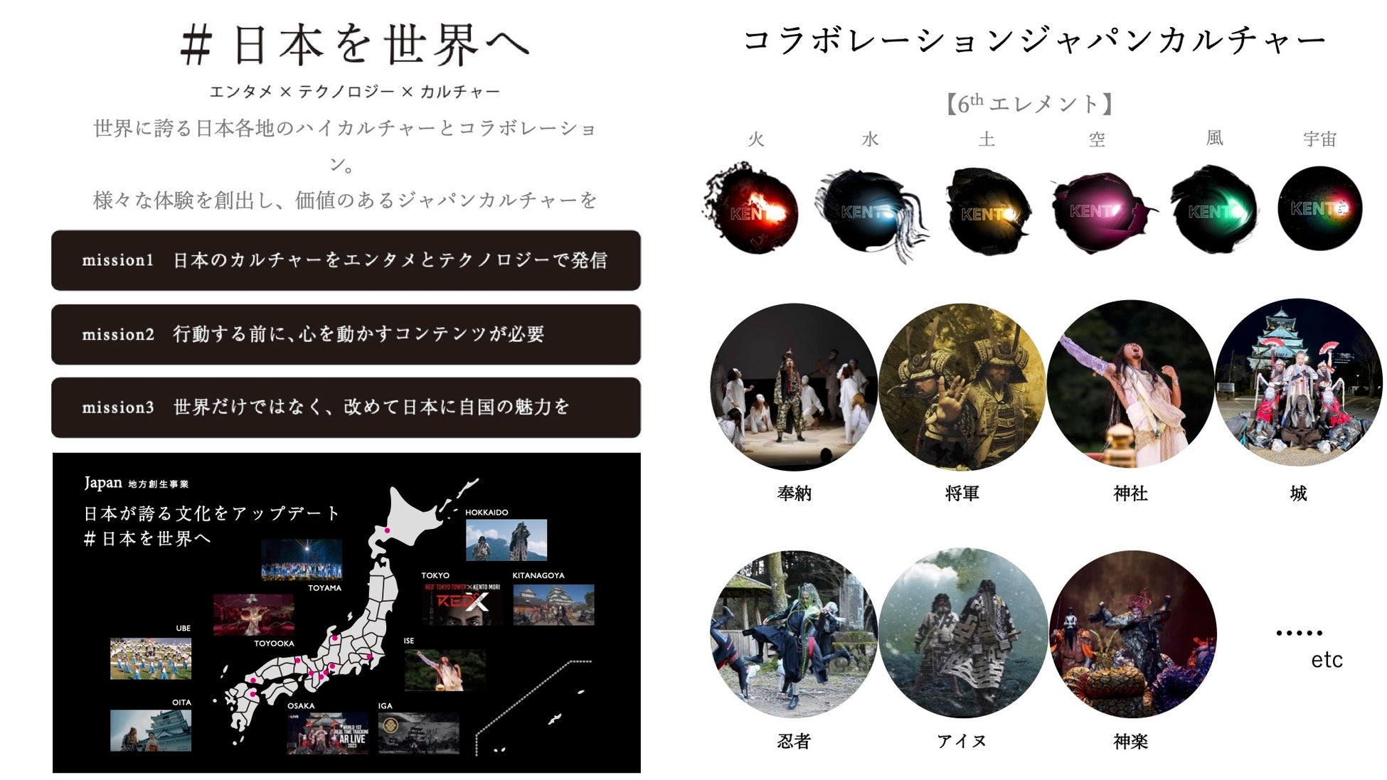 そこへ向けて、日本を代表するコンテンツを詰め込み、世界から訪れる観光客を各地へ送客するきっかけを作りたいと考えています。そこには、世界を舞台に本物に触れてきた確かな経験と実績を持つ、KENTO MORI がその理念とメッセージを込めてプロデュースし、日本が誇るカルチャーと世界基準のエンタメを掛け合わせたコンテンツとして、リアル(EVENT、LIVE、SHOW)、バーチャル(XR LIVE、METAVERSE)で日本の魅力を世界へ届ける観光振興に繋がる一手を担いたいと考えています。伝統と革新、温故知新、日本の精神性、日本の文化を世界に発信することを掲げて「#日本を世界へ」というプロジェクトを始動しました。