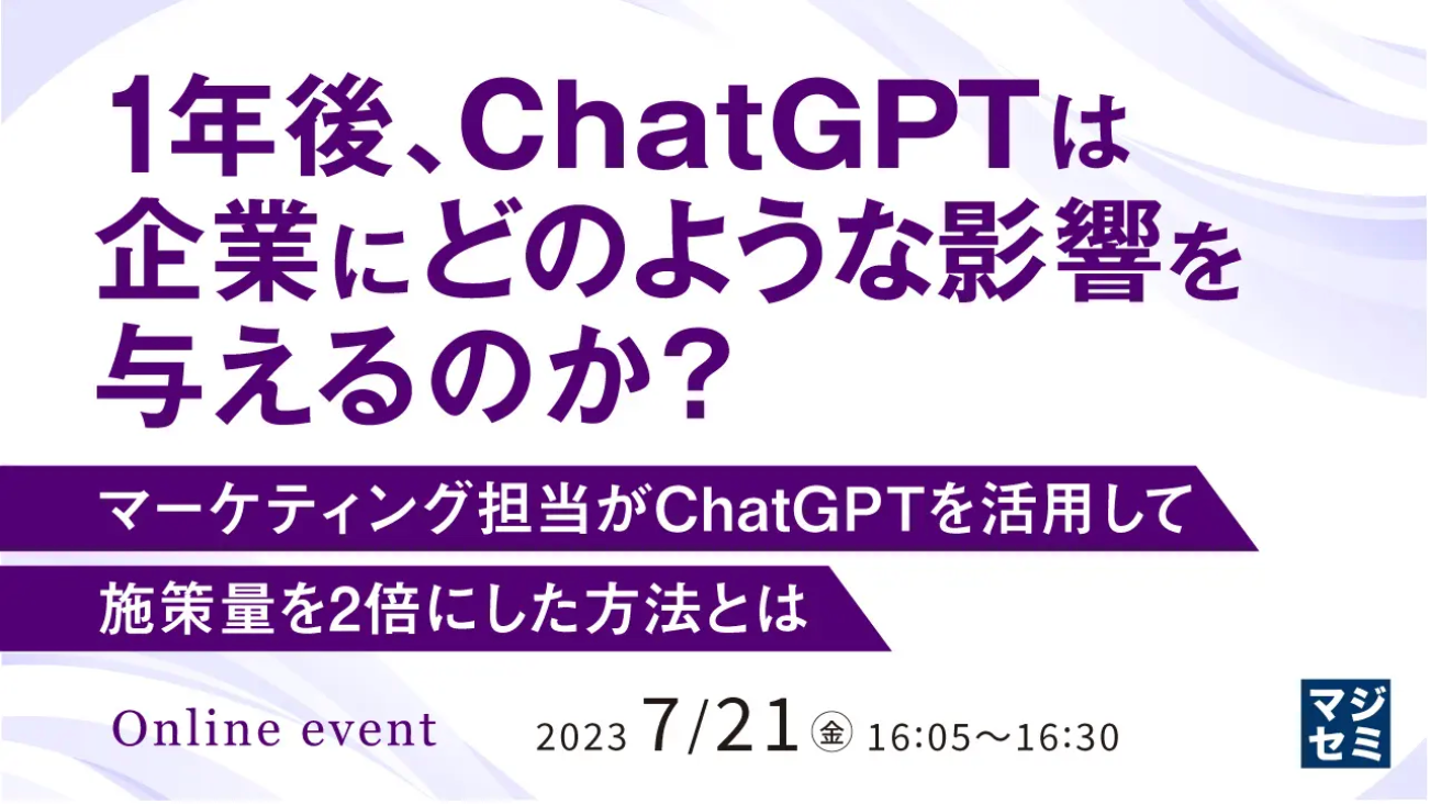 業界の第一線で、実際にChatGPTなどの生成AIを活用している企業をゲストとしてお迎えし、マジセミ代表の寺田とともに、「1年後、ChatGPTは企業にどのような影響を与えるのか?」というテーマで対談を行います。