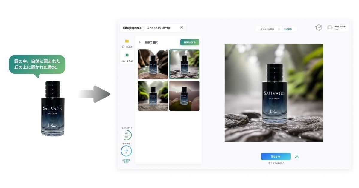 「フォトグラファーAI」は、生成AIを活用したEC・マーケティングのための商品写真自動生成サービスです。サンプル画像をアップロードし、作成したい商品写真のイメージを入力もしくはテンプレートを選択するだけで、クリエイティブな商品写真を短時間で作成することが可能です。