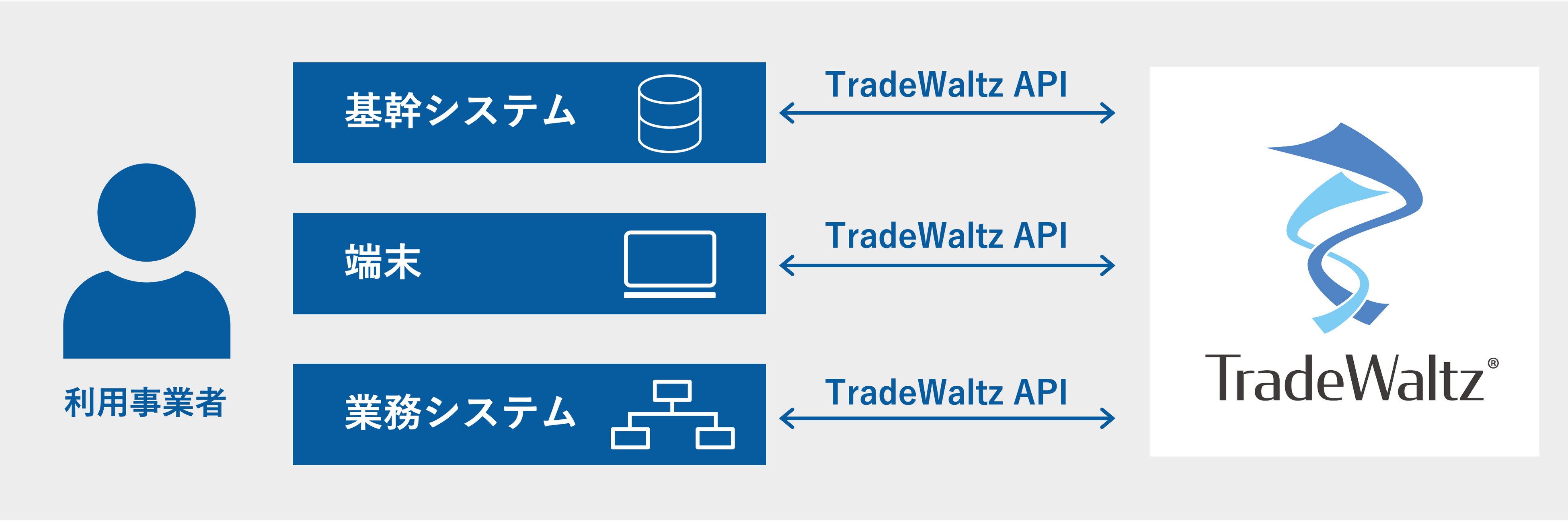 TradeWaltzはAPI仕様を一般公開しております。特に大企業の貿易実務者には、既にご利用されている基幹システムや業務システムから経由してAPI接続をしていただき、認証を通じた高セキュリティ下で、TradeWaltzの契約情報・物流情報登録や、登録情報の閲覧、コミュニケーション支援などを行うことで、現行業務とTW業務の間をシームレスにつなぐ運用をオススメしています。