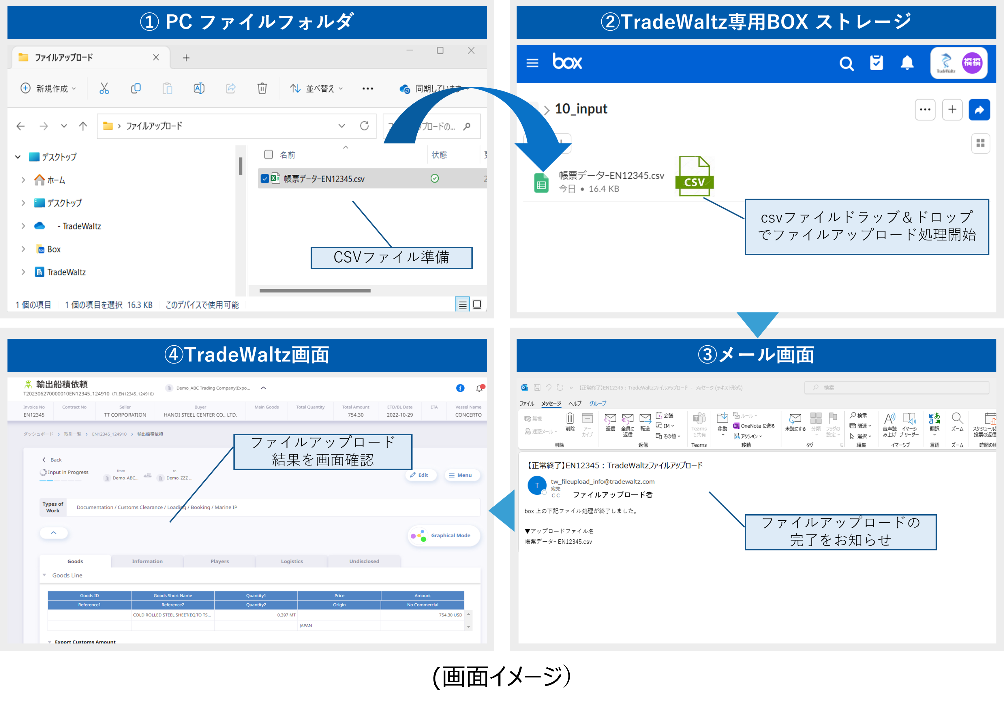 個々の会社様が構築・導入されている自社システムの多くは、Excelに似た形式のCSVファイル(Comma-Separated Values)でデータが出力できます。これをTradeWaltz専用のboxストレージにアップロードいただくと、記載されたデータを自動でRPAが取り込み、TradeWaltzに登録可能なデータフォーマットであるJSON(JavaScript Object Notation)形式に変換したうえでAPIを実行し、TradeWaltzにデータ連携を行うソリューションを実装しました。これをファイルアップロード機能と呼びます。