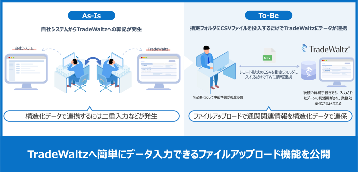 お客様の中には①TradeWaltzと自社システムをAPIで連携するには時間がかかる、②あるいは自社システムがないので、TradeWaltzをまずはUI画面から利用をされるという方も現状多くいらっしゃいます。しかし、前者①特に大企業の一部門が利用される場合、自社システムにデータ入力した後、TradeWaltzの画面にも入力をしなければいけないという 「二重入力」 のケースが発生していたため、より簡便に自社システムとTradeWaltzを連携する手段も模索していました。