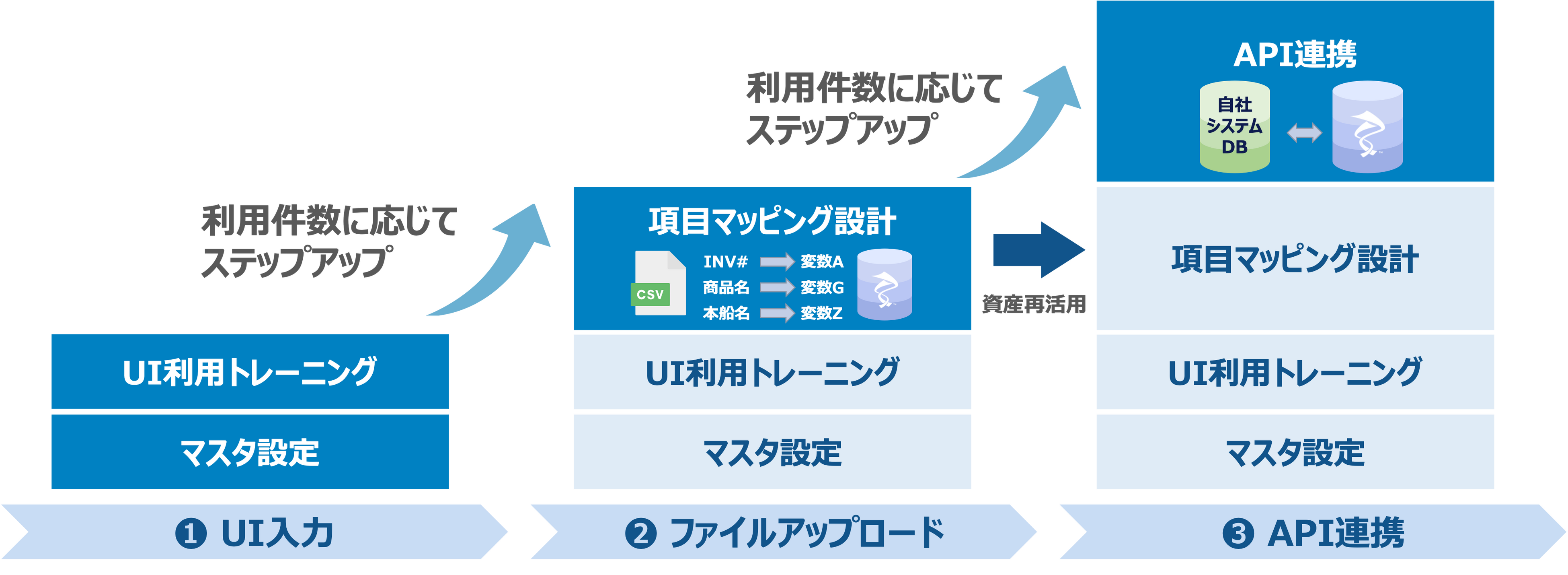 本ファイルアップロード機能の実装・公開を通じて、UI画面とAPI連携の間のStepが埋まり、小さな規模(大企業の一部門等)からTradeWaltzの利用を始め、徐々に利用する規模の拡大(全社等)ができる段階的なサービスをご提供できることとなりました。
