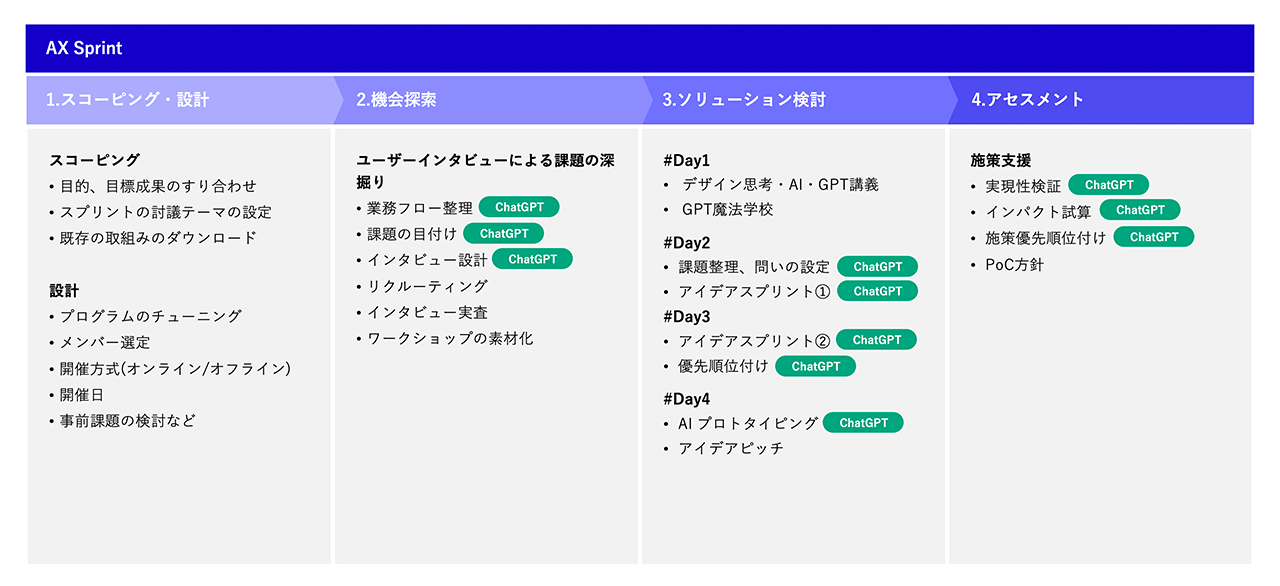 マサチューセッツ工科大学(MIT)の研究※1によるとChatGPTの活用により仕事のスピードが37%早まり、質が20%向上したとされています。今後はさまざまな領域において、ChatGPTを導入するか否かでなく、どのように活用するのかという迅速な検討が必要になることが予想されます。このたび刷新した「AX Sprint」では、DX施策の具体化だけでなく、生成AI活用のユースケース探索や生成AIを活用するプロンプト思考人材育成も可能です。