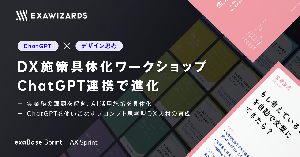 「AX Sprint」は、AI x デザインで企業変革を支援する共創型ワークショッププログラム「exaBase Sprint」を構成する、DX施策の創出に特化したプログラムです。当社が独自開発したアイデア発想サポートツール「AIカード」を駆使しながら、デザイン思考のプロセスに沿ってユーザーを起点にDX施策を具体化します。最短1カ月で成果を出すのも特長で、これまで商社、製薬、人材など幅広い業界の顧客の業務効率や顧客体験の改善といったDX施策を具体化してきました。