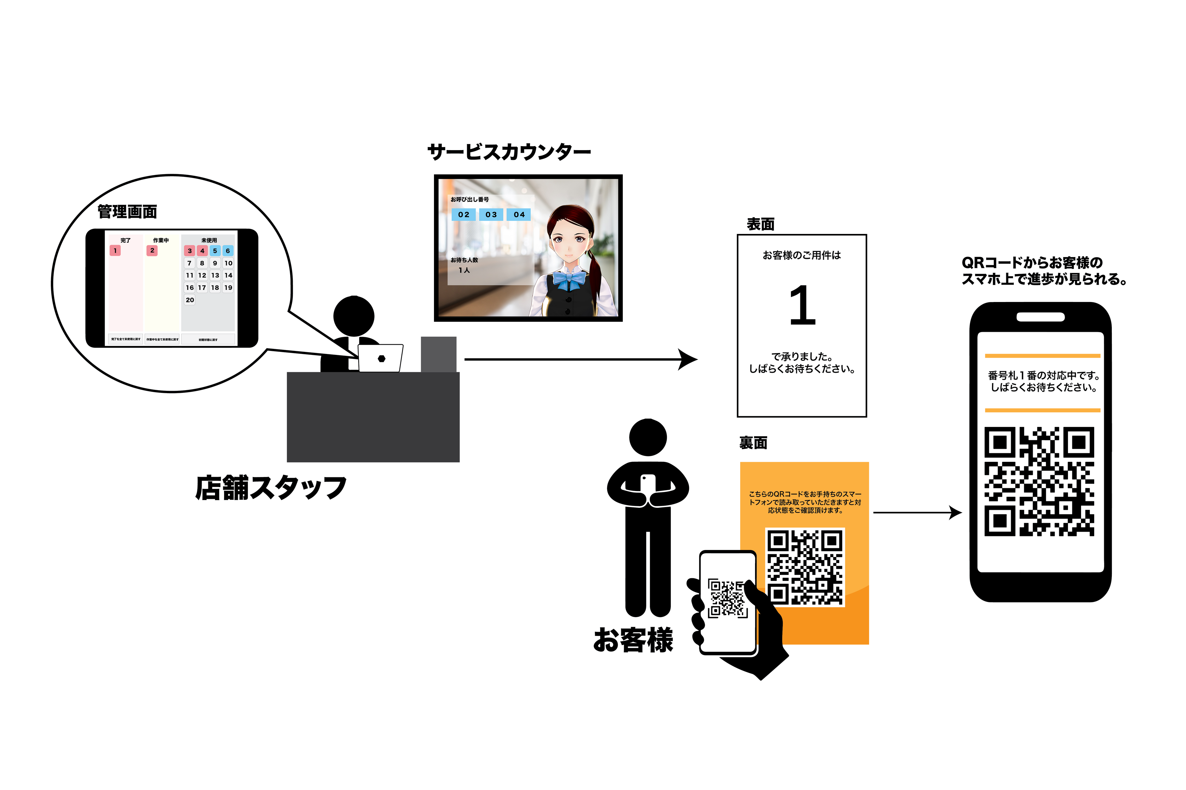 同システムを導入頂くことで、お客様へのお呼び出しをバーチャル店員に任せて自動化することができます。お客様は、受付後に配布されるカードに記載されているQRコードを読み込むことで、受付後の作業状況がいつでも確認できるため、呼び出しの声掛けを聞き逃す心配をすることなく、待ち時間の間、自由に店内を回遊することが可能です。