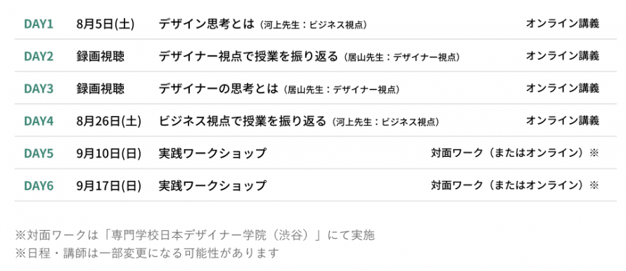 ・実施方法:オンライン配信(DAY1〜4)、対面ワーク(DAY5・6)