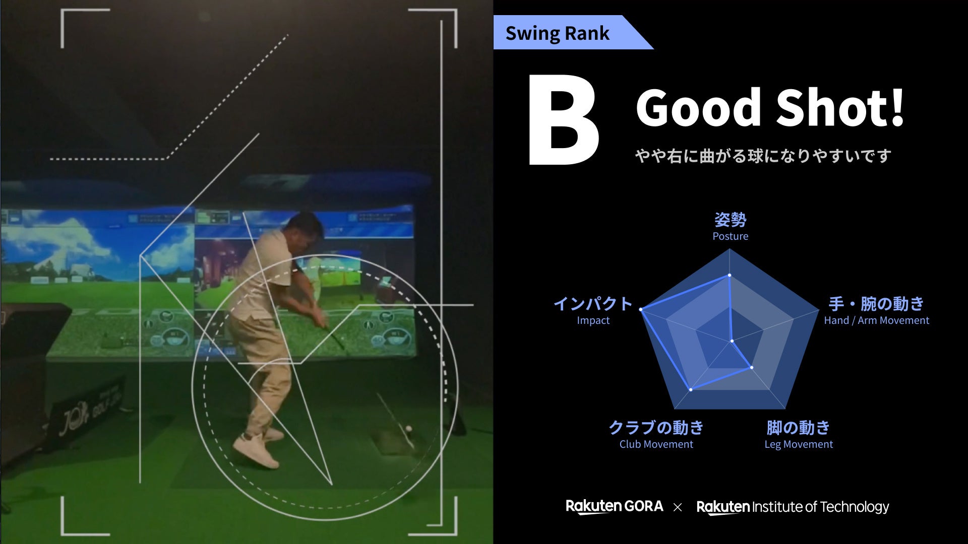 「フューチャーフェスティバル」内の「ディスカバリーエリア」では、最新のAI技術を活用し、楽天と「楽天技術研究所(Rakuten Institute of Technology)」、外部の機関が共同で開発中の「楽天GORA AIゴルフスイング診断チャレンジ!」を体験できます。シミュレーションゴルフでスイングを行うと、AI(コンピュータビジョン)技術によって姿勢や手、腕、ゴルフクラブの動きなどが解析され、スイングがランク別に評価されます。体験後には抽選会に参加することができ、ゴルフや「お買いものパンダ」に関連したグッズなどが進呈されます。ゴルファーにとってはスキルアップの参考となるデータが得られ、またゴルフ未経験者においては、初めてのゴルフスイングを楽しく体験できるコンテンツとなっています。