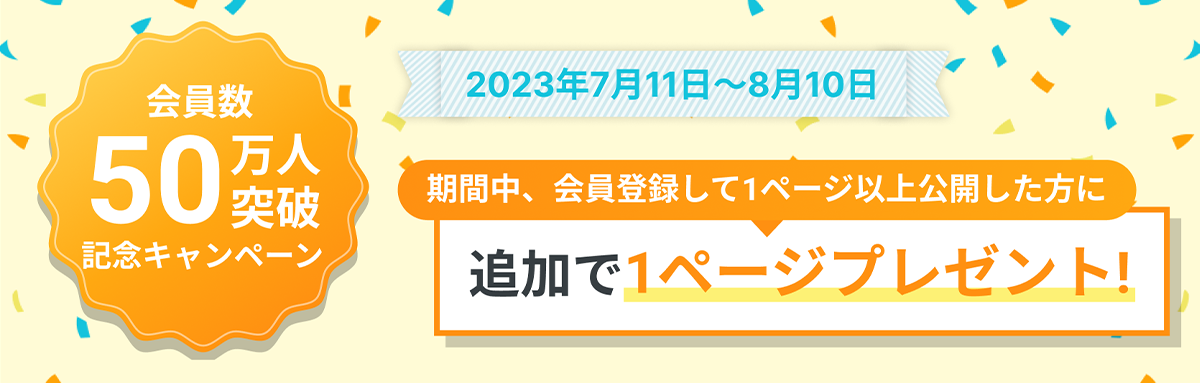 会員数50万人突破に伴い、公開可能ページをプレゼントするキャンペーンを7月11日(火)より開始いたします。
