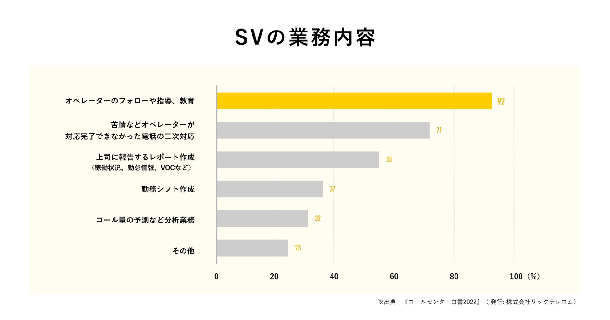 『2022年度 コールセンター白書』の調査によると、コロナ禍を経て経済活動が本格化する中で、飲食や観光業界などから流入していた人材が元の業界に戻り、コンタクトセンター市場の人手不足は再度深刻化しております。離職を防ぐために人材マネジメントは喫緊の課題となっておりますが、その一方でマネジメントを担うSV※の業務過多があるのも事実です。本調査によると従来SVがマネジメントするオペレーターの数は7人が標準とされる中で、8人以上の担当していると答えたSVが過半数を越えました。そこでカラクリは、SVの主な業務の92%を占める「オペレーターのフォローや指導、教育」業務の負荷を軽減し、現場の好循環を生みだすために新人オペレーター育成の支援ツールを開発する運びとなりました。