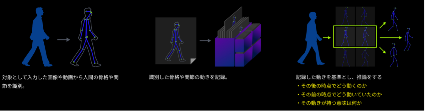 人の歩き方から情報を識別、映像などから特徴や違いを抽出し個人を特定します。
