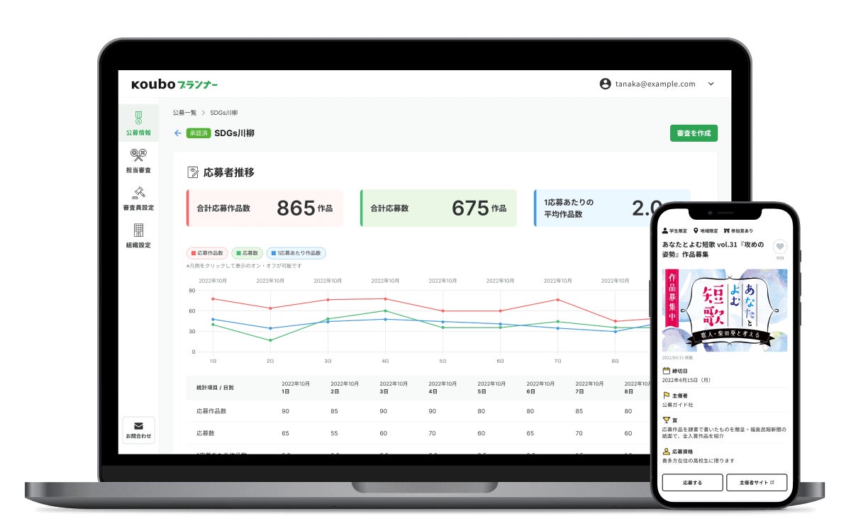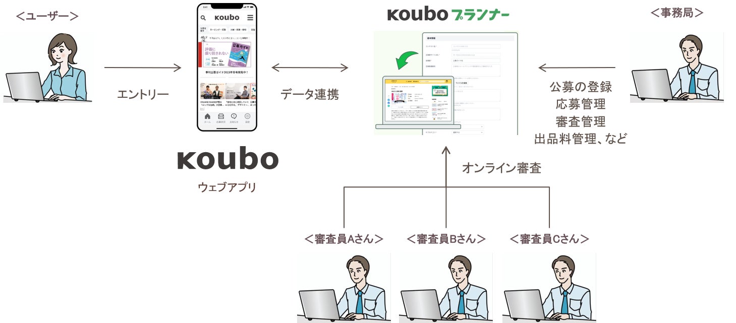 応募者はウェブアプリ「Koubo」からエントリー。主催者は応募作品や審査を「Kouboプランナー」でまとめて管理できます。