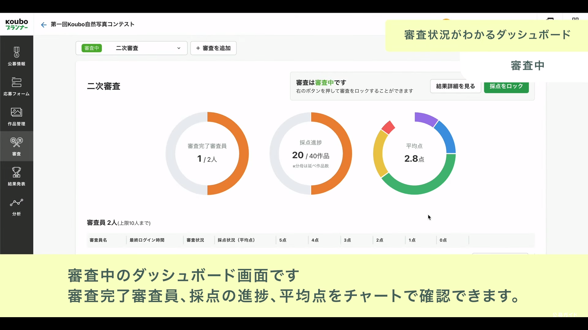 複数の審査委員による評価、多段階審査、投票・採点方式対応など、様々なパターンの審査フローに適応。また各審査員の審査状況をリアルタイムに把握できる管理画面が実装されているため、審査の進捗や採点のばらつきなどを最適化できます。