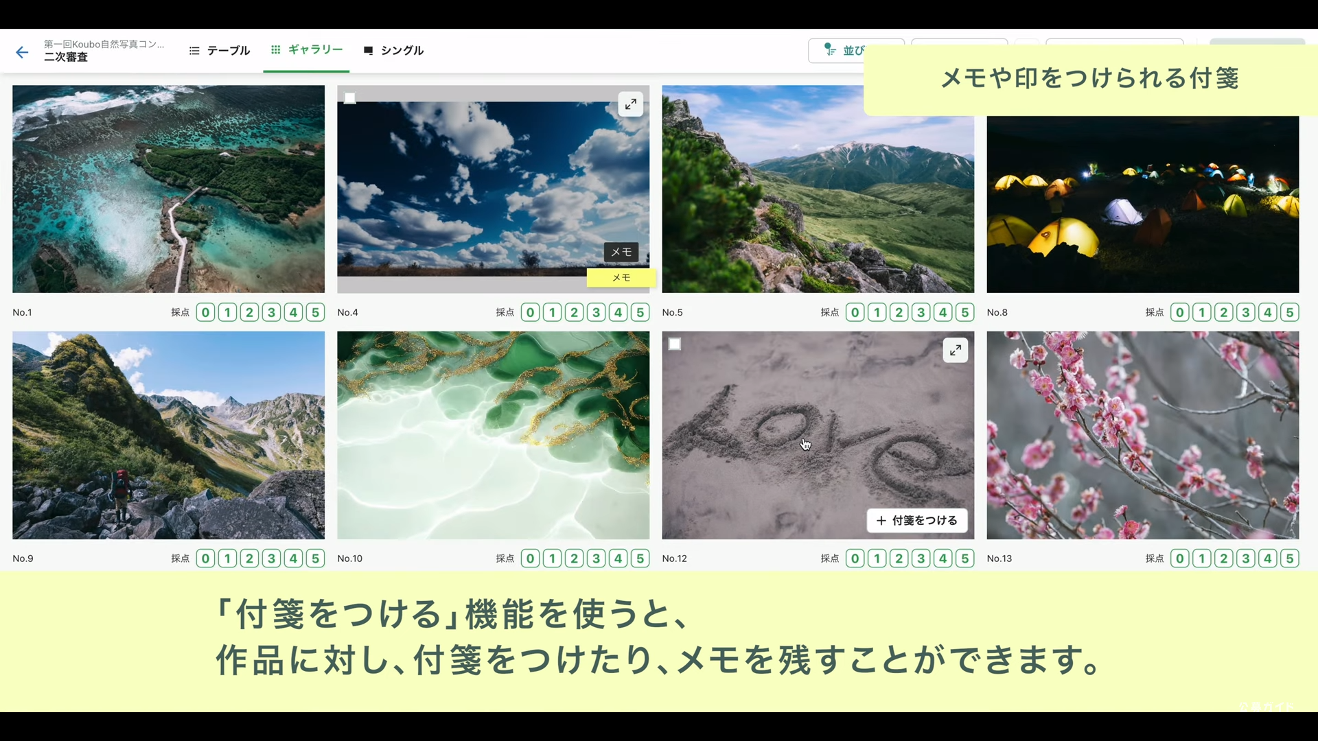 ギャラリービューでの審査画面。コメント機能もあり審査が快適です。