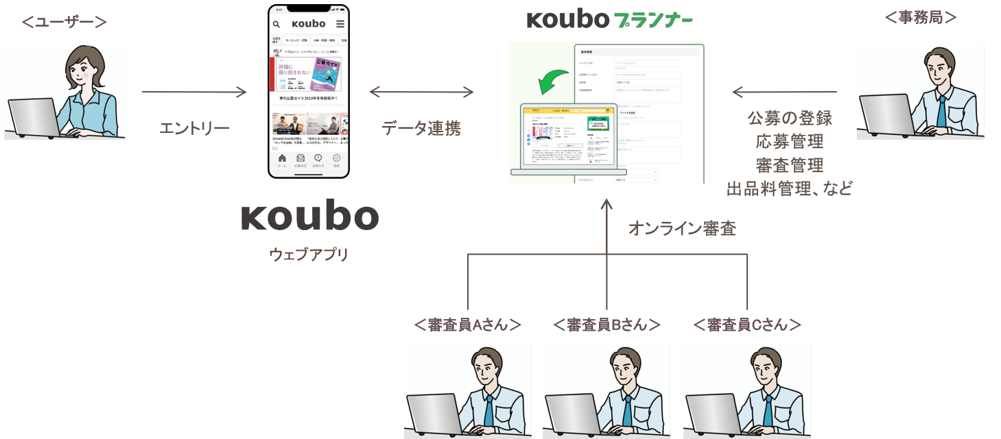 応募者はウェブアプリ「Koubo」からエントリー。主催者は応募作品や審査を「Kouboプランナー」でまとめて管理できます。