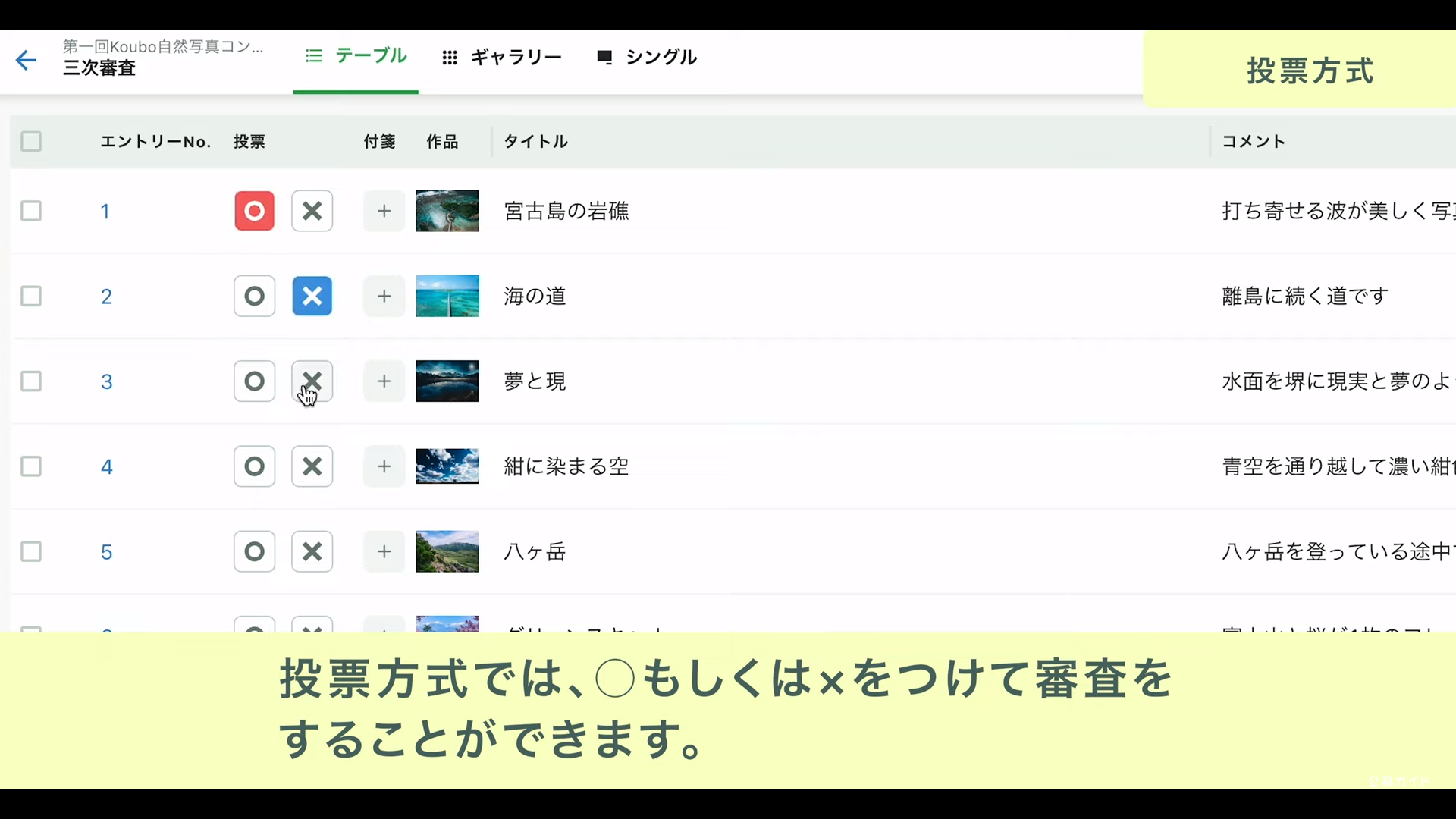 〇×方式の審査画面。作品数の多い一次審査にもピッタリ。