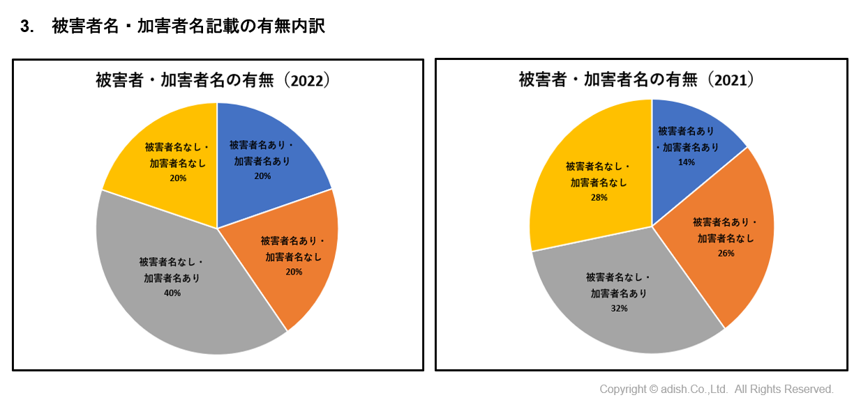 「被害者名あり・加害者名あり」は20%と、6%(前年度14%)増加し、「被害者名あり・加害者名なし」は20%と6%(前年度26%)減少しました。