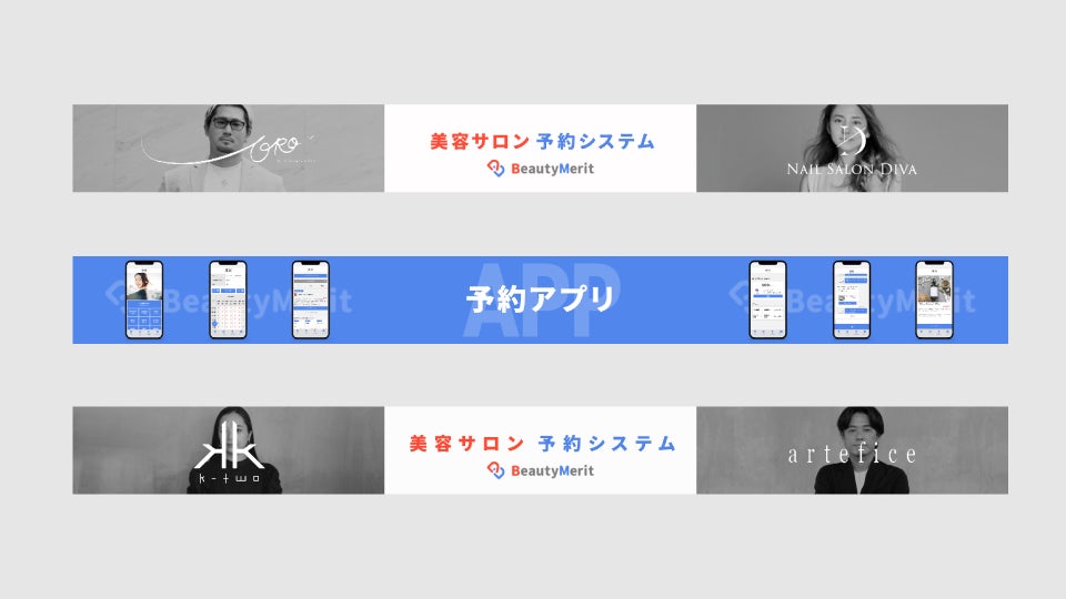 「BeautyMerit(ビューティーメリット  以下、当サービス)」は、美容室・美容サロンの店舗独自のiPhone・Androidアプリを作成し、美容室・美容サロンのお客様にアプリをダウンロード(無料)して頂くことで、アプリ上での予約受付や、クーポン利用、サロン情報の確認などができるサービスです。「現在大手12社の美容集客サイト」並びに「Google社」、「LINE社」、「Meta社(InstagramやFacebookを運営)」との3社ともシステム連携をしており、予約やスタッフのシフト管理の一元化が図予約やスタイリストのシフトの管理を一元化が図れます。従来、美容室・美容サロンでは電話予約が中心で、定休日や営業時間外は予約受付ができないサロンが中心でしたが、当サービスを利用すると24時間365日、予約を一元で管理することができるようになります。美容室・美容サロンにはASP形式でサービス提供し、店舗設定画面上(管理画面)でリアルタイムに情報を更新することができます。