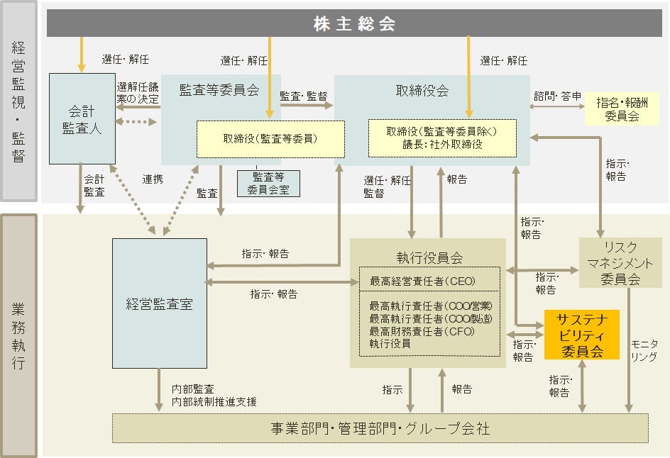 「サステナビリティ委員会」は、代表取締役社長執行役員CEOを委員長とし、委員として業務執行取締役および執行役員により構成されます。サステナビリティに関する基本方針の策定やマテリアリティ(重点課題)の特定、マテリアリティごとの活動計画や目標設定ならびにその進捗管理、そしてそれらの情報開示に関する事項等の審議および業務指示を行い、定期的に取締役会へ報告・提案を行います。また、同委員会配下に「CO2削減」「廃棄物削減」「人権尊重」に関する社内の部門横断チーム「タスクフォース」を組成し、それぞれのタスクの進捗管理を行い、各マテリアリティへの取組みを加速させてまいります。