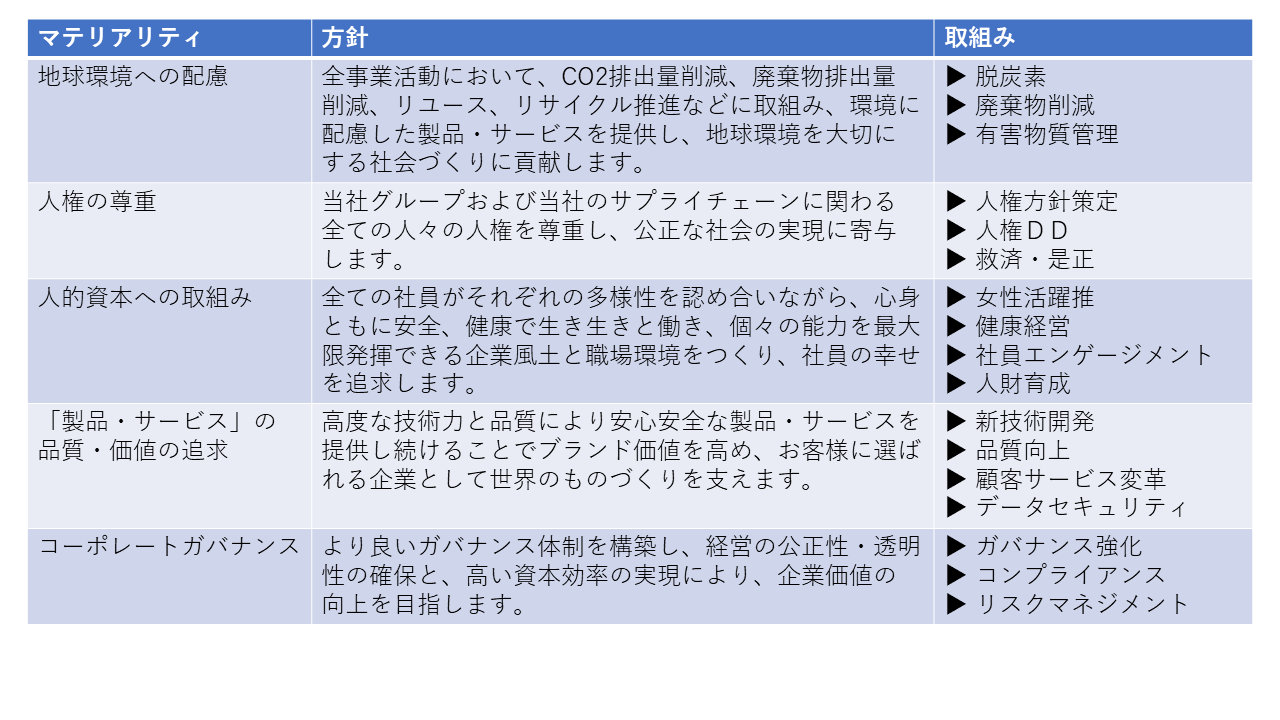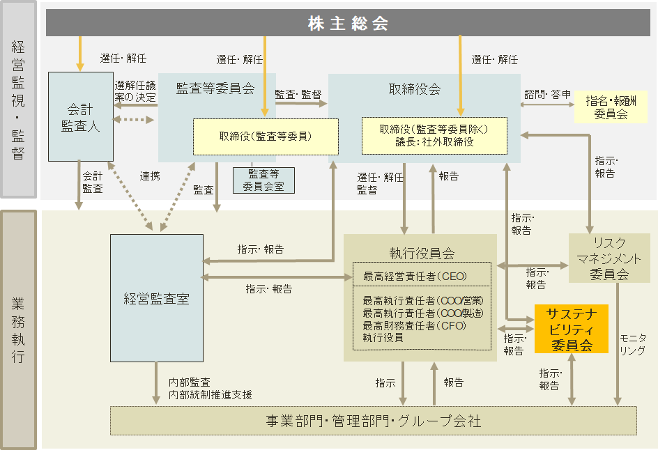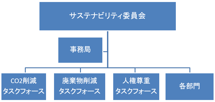 「サステナビリティ委員会」は、代表取締役社長執行役員CEOを委員長とし、委員として業務執行取締役および執行役員により構成されます。サステナビリティに関する基本方針の策定やマテリアリティ(重点課題)の特定、マテリアリティごとの活動計画や目標設定ならびにその進捗管理、そしてそれらの情報開示に関する事項等の審議および業務指示を行い、定期的に取締役会へ報告・提案を行います。また、同委員会配下に「CO2削減」「廃棄物削減」「人権尊重」に関する社内の部門横断チーム「タスクフォース」を組成し、それぞれのタスクの進捗管理を行い、各マテリアリティへの取組みを加速させてまいります。