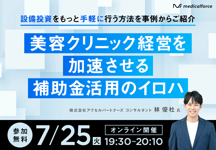 そこで今回は、補助金活用のプロである株式会社アクセルパートナーズ林氏をゲストにお迎えし、美容クリニック経営に効果的な補助金活用の方法について、事例を交えながらご紹介します。