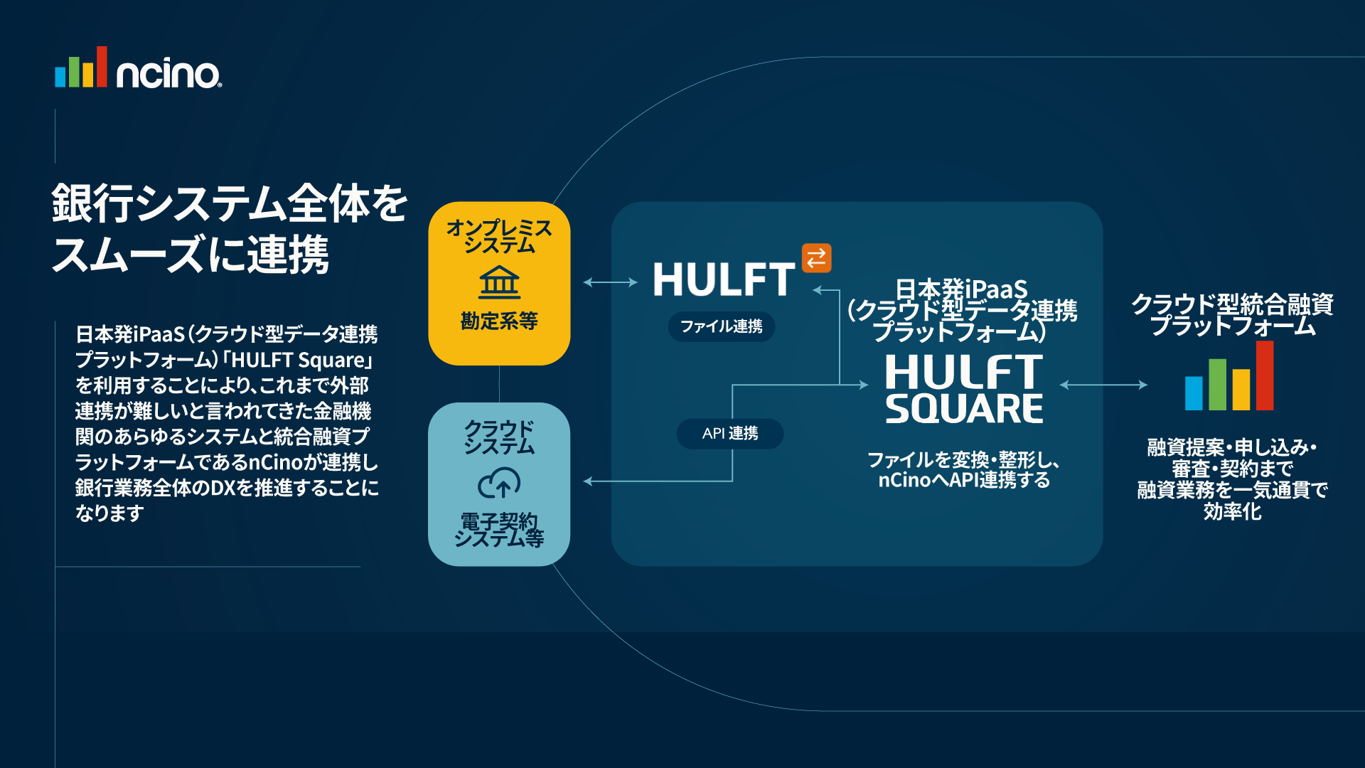 銀行業界は競争環境の激化や顧客の期待値の高まりにより、デジタルトランスフォーメーション(DX)が急務となっています。しかし、思うように進まない要因の一つに、勘定系などのオンプレミスシステムとクラウド環境の周辺業務システムを連携させる際の、インターフェース開発にかかる膨大な工数とそれに伴うコスト増があります。今回発表した連携ソリューションの『nCino』は融資プロセスの一元管理を実現し『HULFT Square』と『HULFT』を利用しオンプレミス環境とデータ連携することにより、インターフェース開発の工数とそれに伴うコスト増を抑え銀行業務のDX推進を支援します。