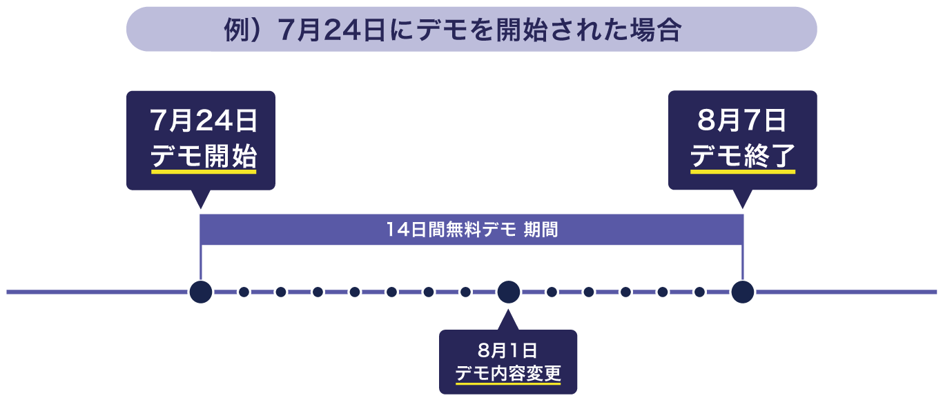 8月1日をまたいで無料デモをご利用いただく場合でも、デモ期間は14日間のままになりますのでご注意ください。(下記図参照)
