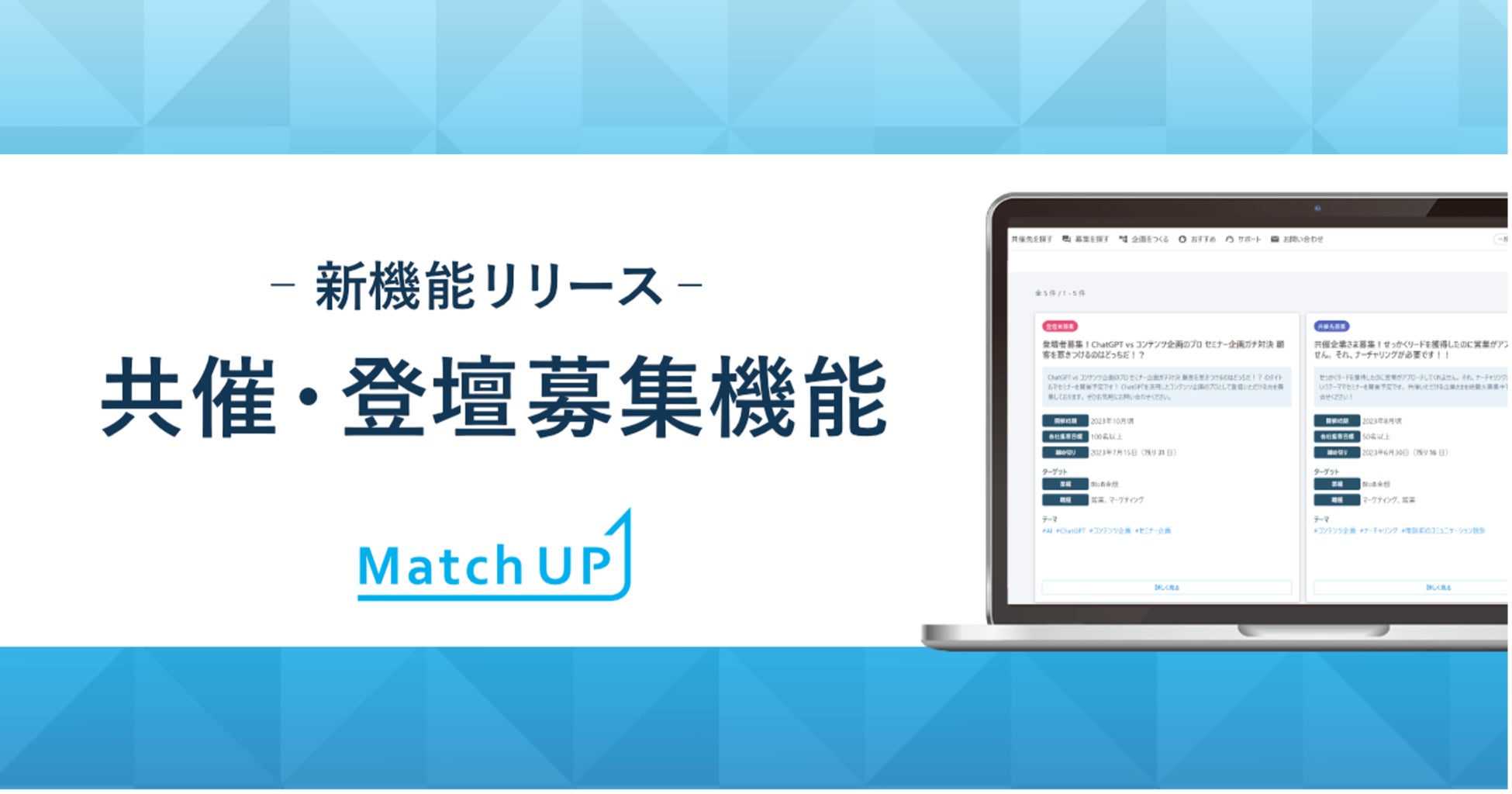 当社は、国内最大級のオンライン展示会「ITトレンド」や、ビジネス動画プラットフォーム「チラヨミ」を通して、多くの企業様、業界専門家の方とのお取引があり、自社のマーケティングノウハウを活かし、このような課題を解消するため、業界専門家にセミナー登壇オファーができるマッチングプラットフォーム「Match UP」の提供を開始いたしました。