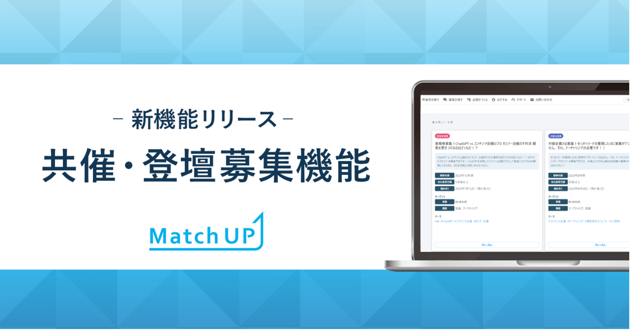 当社は、国内最大級のオンライン展示会「ITトレンド」や、ビジネス動画プラットフォーム「チラヨミ」を通して、多くの企業様、業界専門家の方とのお取引があり、自社のマーケティングノウハウを活かし、このような課題を解消するため、業界専門家にセミナー登壇オファーができるマッチングプラットフォーム「Match UP」の提供を開始いたしました。