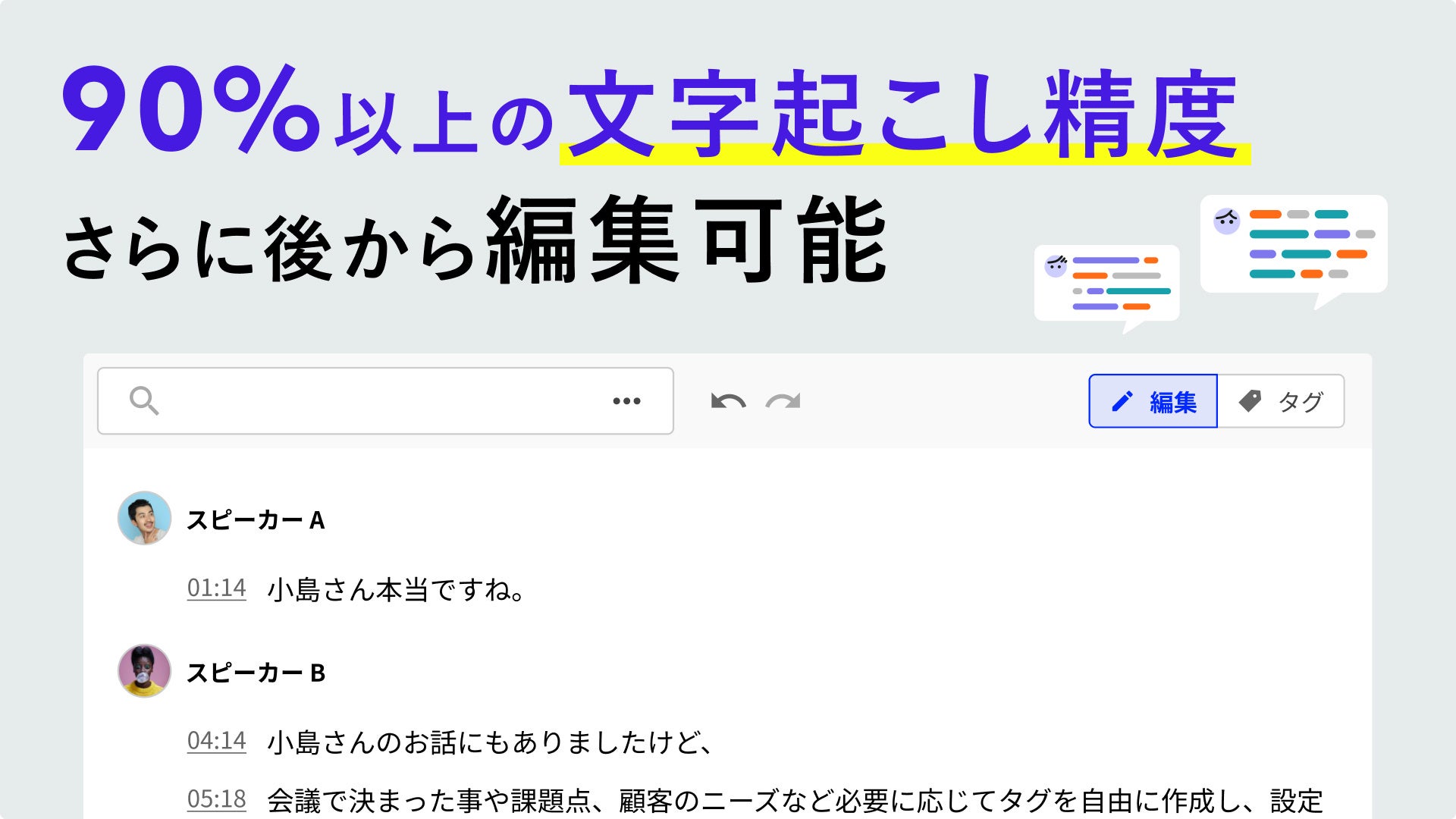 ファイルをアップロードするだけで、発話者別の高い精度の文字起こしが完了します。誤字があっても修正が可能なので、より高精度な文字起こしを実現可能です。動画などの映像とセットで確認することで、会議やミーティングに参加していなくても、文脈や状況を鮮明に理解することが可能です。