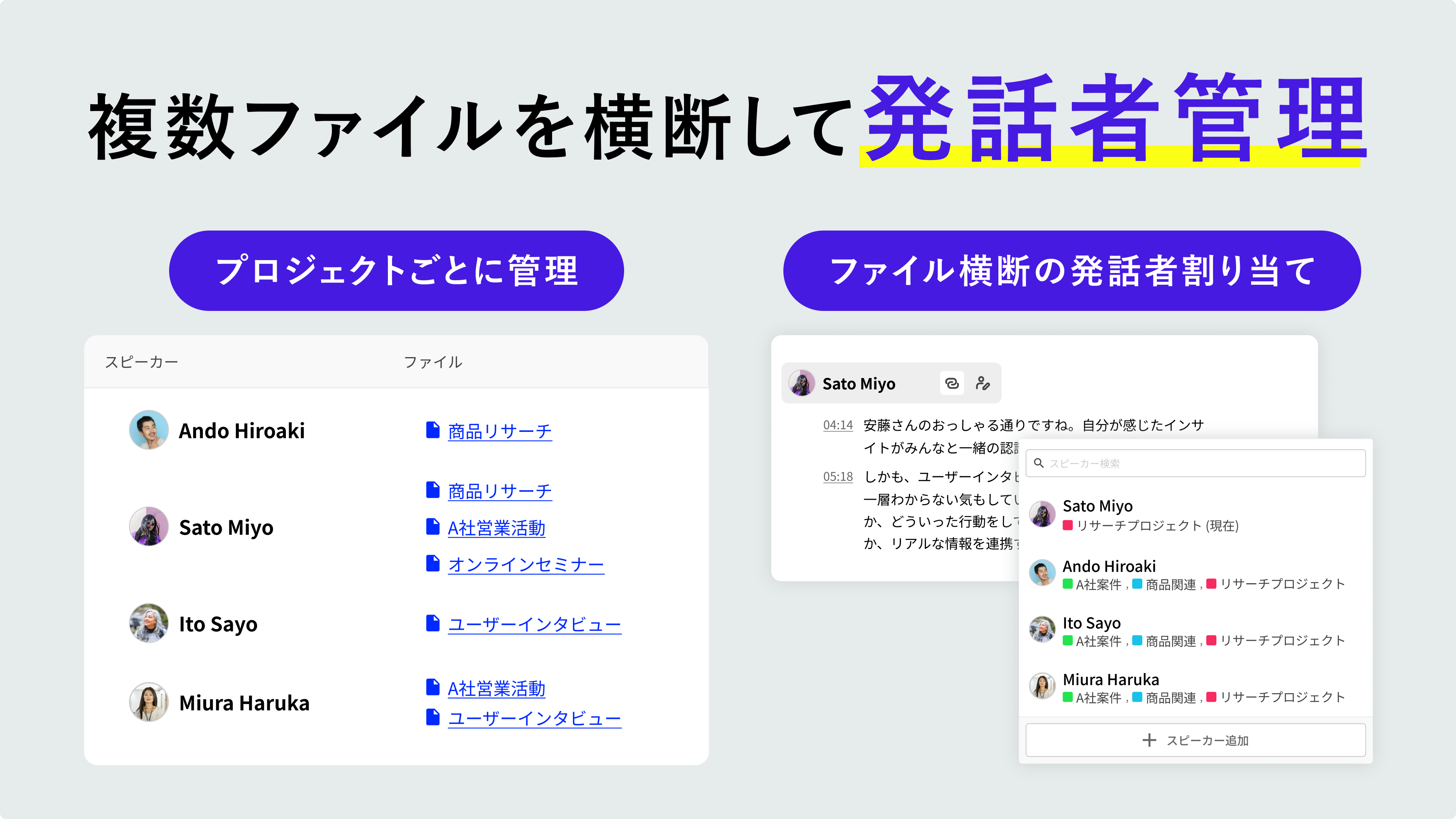 複数のファイルを横断して発話者を登録・管理することが可能なため、誰がいつ何を話したのかまとめることが可能です。継続的にコミュニケーションをおこなう大切なキーパーソンやクライアント、複数回実施するユーザーインタビューや採用面接など継続的にログとして残すことが可能です。