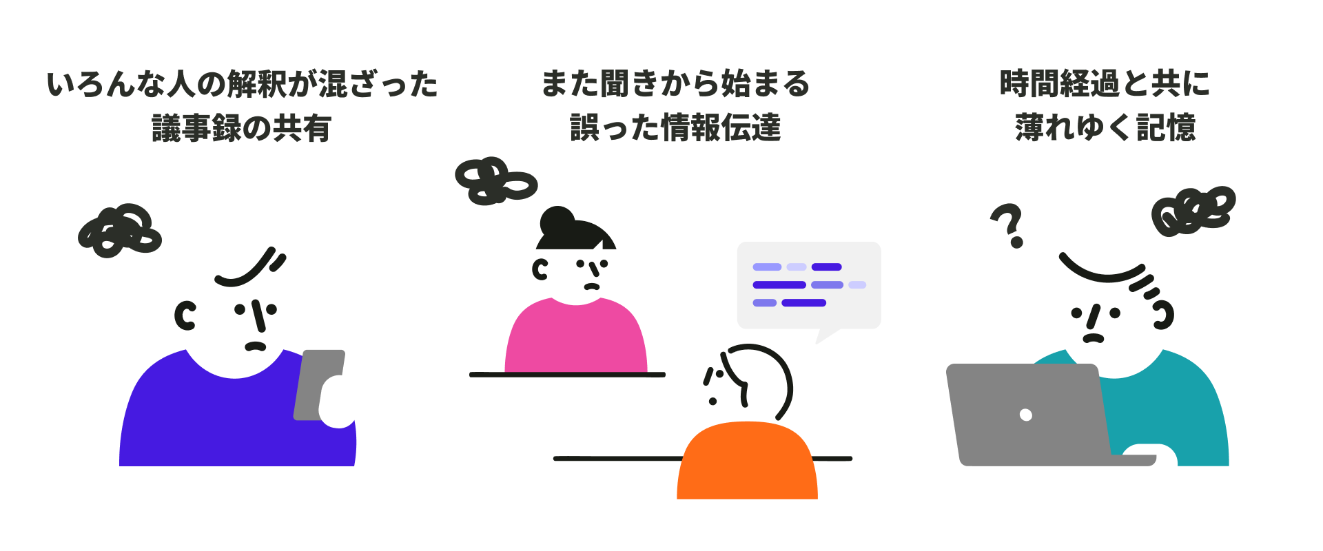 しかし、コミュニケーションの要点をテキストファイルやメール、チャットで共有するだけでは、文脈ややり取りの全体像が見えず、「なぜこうなったのか」といった背景情報が不明瞭になってしまいます。また、コミュニケーション中に聞き逃してしまったり、後で発言内容を思い出せないなど、記憶に頼ったコミュニケーション管理には限界があります。