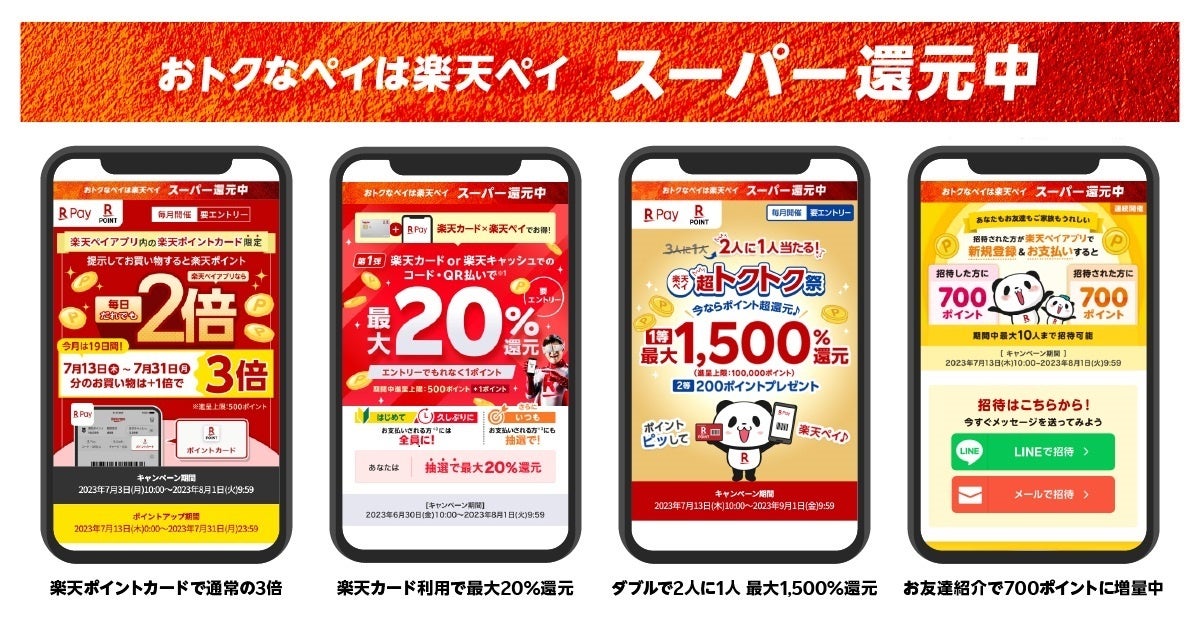 「楽天ペイ」アプリでは、今夏「おトクなペイは楽天ペイ スーパー還元」キャンペーンとして、「楽天ペイ」アプリ内の「楽天ポイントカード」を提示して会計すると、「楽天ポイント」が通常の3倍進呈されるキャンペーン、「楽天ポイントカード」提示と「楽天ペイ」アプリ利用で最大1,500%還元される「2人に1人当たる!楽天ペイ超トクトク祭」、「お友達紹介キャンペーン」などさまざまなお得なキャンペーンを実施します。