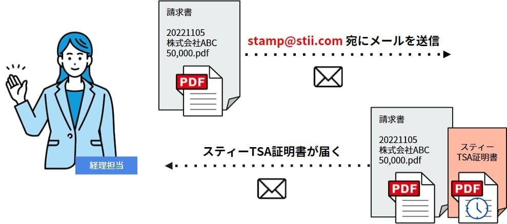 ①メールの宛先にstamp@stii.comを入力し、タイムスタンプを付与したいファイルを添付してメールを送信。