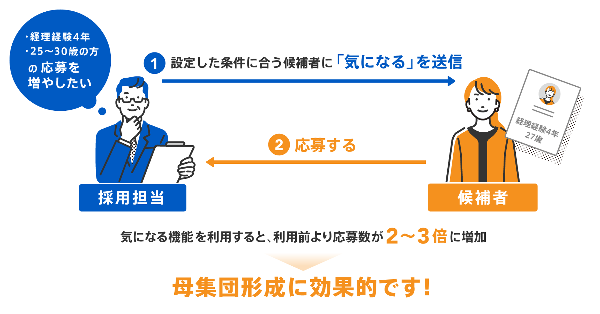 通常、候補者の応募は認知度が高い企業に集中しますが、この機能を使用することでペルソナになり得る候補者に素早くアプローチすることが可能です。そのため、従来の転職サービスでは迅速な認知度の向上が難しい求人でも、より多くの集客をすることができます。