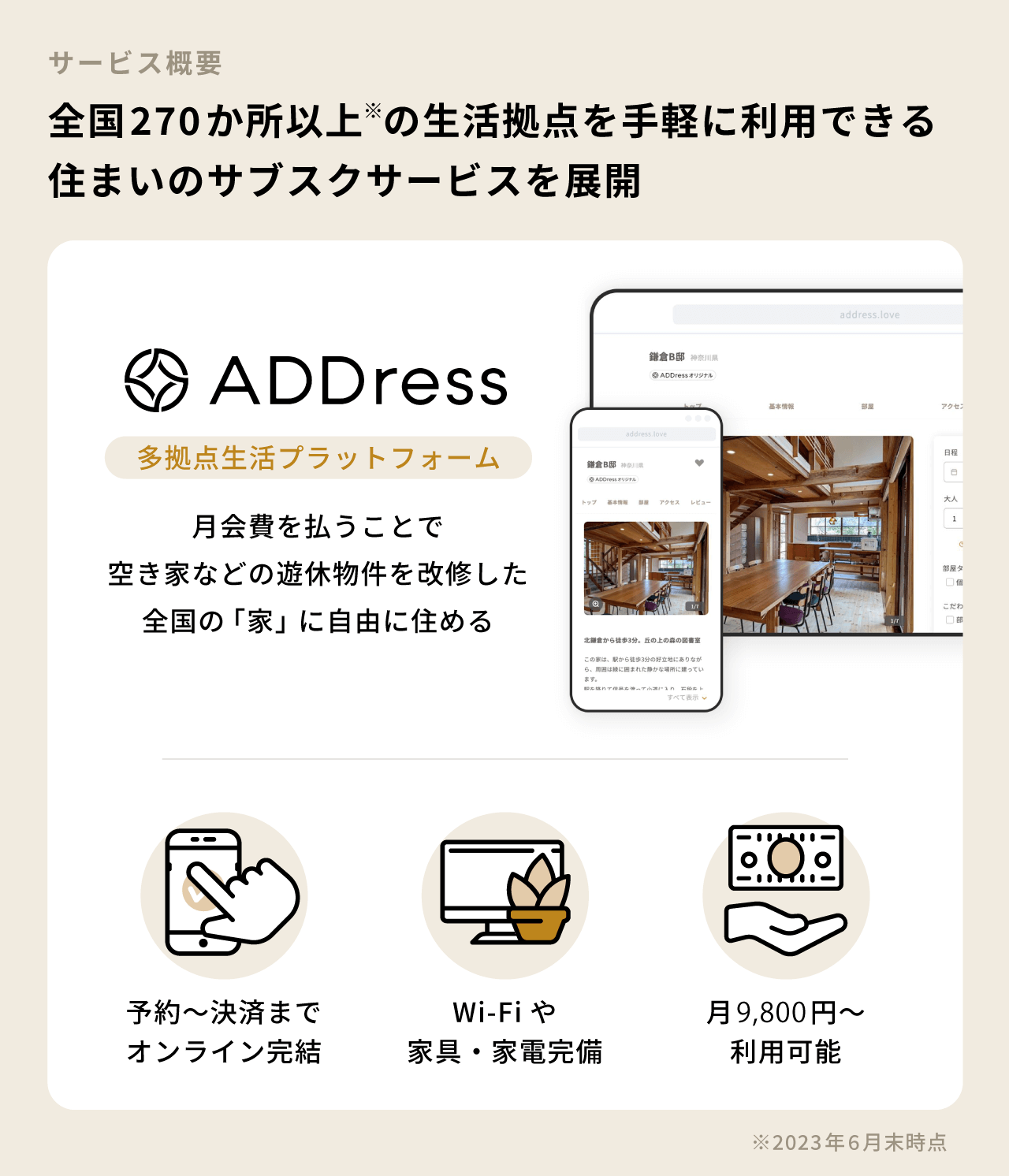 ADDressは、全国270か所以上(2023年6月末時点)の生活拠点に滞在できる「住まい」のサブスクリプションサービスです。地方の遊休物件をADDressの住まいに活用して月9,800円(2泊分)から提供し、会員は手軽に「ワ―ケーション」や「多拠点生活」を実践できます。