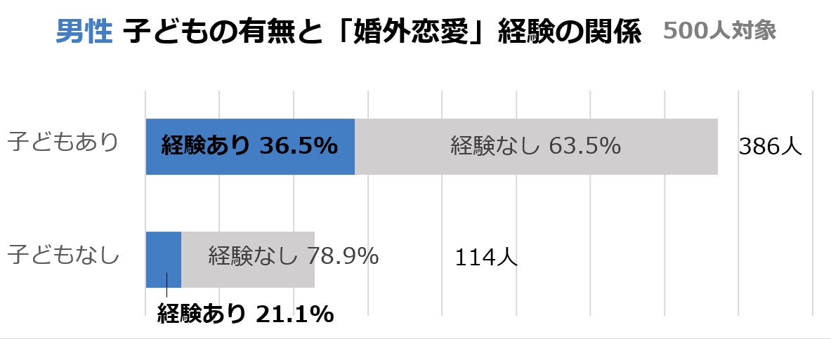 男女全体では、「子どもなし」で「婚外恋愛の経験あり」の割合が15.0%だったのに対し、「子どもあり」で「経験あり」の割合は25.6%と、10ポイント以上の差がつきました。