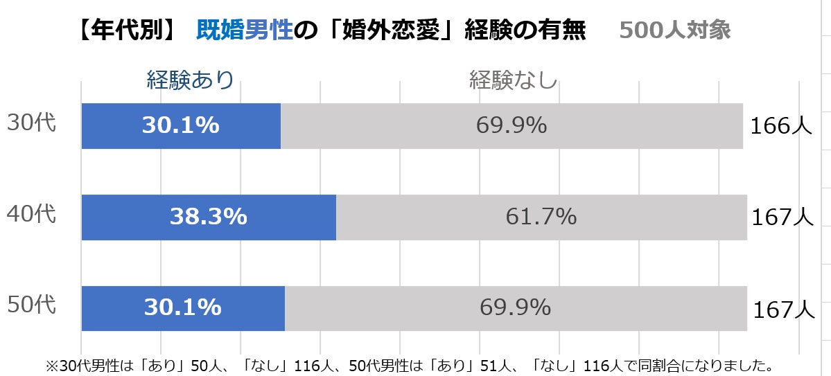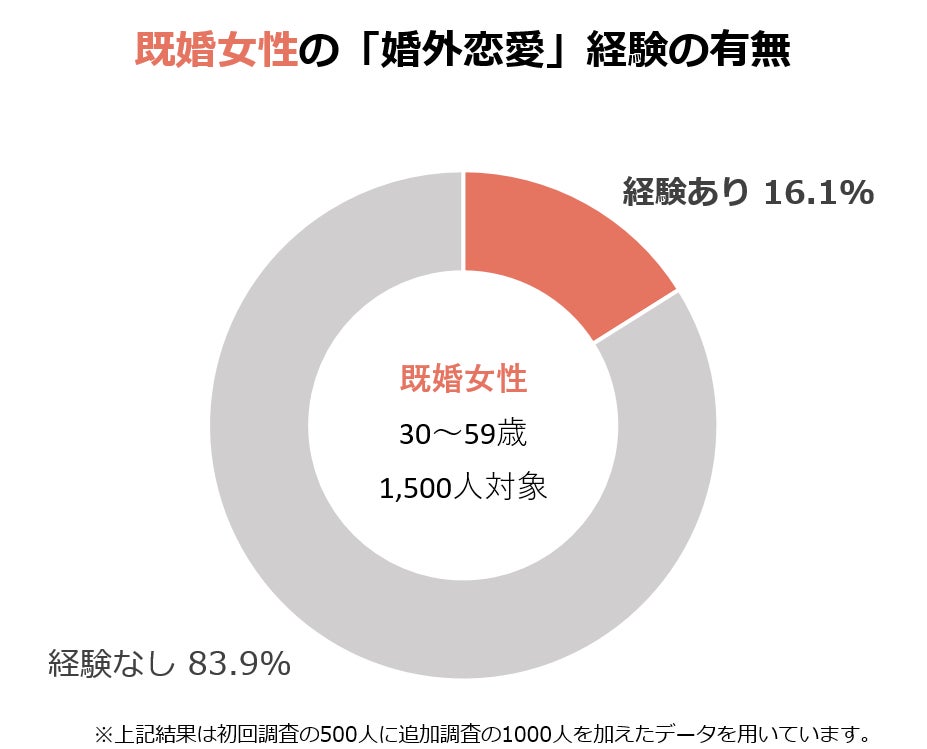 なお、今回は男女同数の1,000人を対象に初回調査を行った結果、女性の「婚外恋愛の経験あり」人数が少なかったため、女性1,000人を対象に追加調査を行いました。女性限定で内訳などを示す際は精度を高めるために初回・追加分を合わせた1,500人のデータを使用し、男女同数での比較が重要な場合は初回分のみの500人のデータを使用しています(グラフには注記を盛り込みました)。